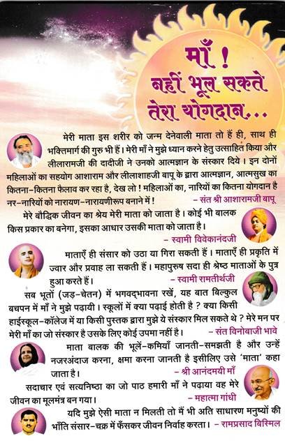 सारा समाज ऋणी है उन माताओं एवं सद्गुरुओं का, जिन्होंने इस धरा को ऐसी-ऐसी अनमोल विभूतियाँ दीं। अनंत-अनंत प्रणाम हैं उन पूजनीया माताओं को, जिन्होंने अपनी संतानों को भक्ति, वीरता, कर्मयोग, प्रभुप्रीति, सत्संग आदि के सुसंस्कारों से सुसज्जित किया एवं अनंत-अनंत प्रणाम हैं उन ब्रह्मवेत्ता सद्गुरुओं को, जिन्होंने उन सुसंस्कारों से सुसज्ज हृदयों में ब्रह्माकार वृत्ति जगाकर संस्कार-विकार, सज्जनता-दुर्जनता, सुख-दुःख, उत्थान-पतन – इन द्वन्द्वों से परे की यात्रा कराते हुए उन्हें ब्रह्मपद में जगा दिया।