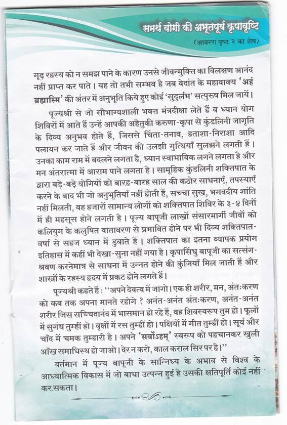 आजकल 'योग' शब्द से काफी लोग प्रभावित हैं । केवल योगासन या कुछ क्रियाएँ या कोई कोर्स करके कल्पना कर लेना कि 'मैंने योग कर लिया' यह तो आत्मवंचना कहलायेगी । ब्रह्मवेत्ता महापुरुषों की दृष्टि में कुछ करने का नाम वास्तविक योग नहीं है । ऐसे महापुरुषों के प्रति श्रद्धा, प्रेम, सेवा-समर्पण से उनकी अहैतुकी करुणा-कृपा द्वारा सहज में ही जो हो जाता है वह वास्तविक योग है । प्राणायाम, आसन आदि क्रियाएँ और कोई भी साधन न करनी पड़े, अपने आप होने लग जाय और आनंद व अनुभूतियाँ ऐसी अलौकिक हों कि उनका पूरा वर्णन शब्दों में न हो सके, ऐसा सहज, रसमय एवं विलक्षण वह 'कुंडलिनी शक्तिपात योग' है एवं ब्रह्मविद्या रूप 'ज्ञानयोग' का तो कहना ही क्या है ! इन दोनों का पूर्ण अऩुभव जिन महापुरुष को हो उनके साधक उन्नति के गगन में ऊँची उड़ाने भरने लगते हैं । ऐसे संत तो कभी-कभी, कहीं-कहीं धरती पर प्रकट होते हैं । उनमें भी परम दुर्लभ महापुरुष हैं कलियुगी माहौल से प्रभावित लाखों-लाखों लोगों पर एक साथ शक्तिपात कर उनके लिए दिव्य अनुभूतियों के अथाह खजाने को खोलने वाले पूज्य संत श्री आशाराम जी बापू, जिन्होंने वह रसमय योगयात्रा सामान्य जनों के लिए भी परम सुलभ करायी । कुछ अंश में भी उनकी कृपा को झेलने वाले को वे दिव्य अनुभूतियाँ होने लगती हैं जो बड़े-बड़े योगियों को 12-12 वर्ष की कठोर साधनाएँ, तपस्याएँ करने के बाद भी नहीं होतीं ।