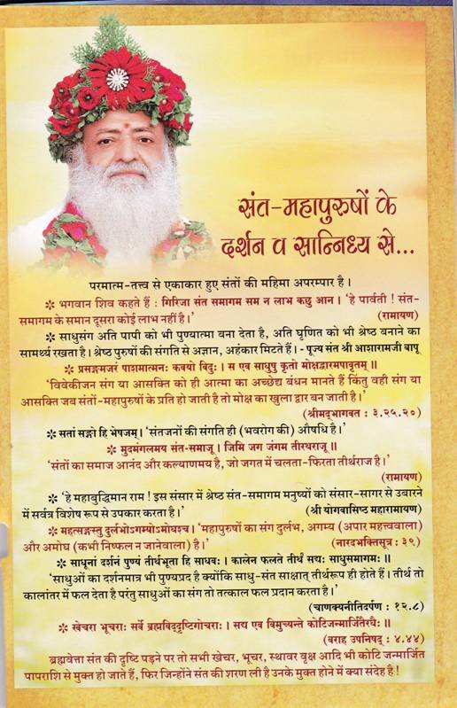 परम सुख देने वाले, शांत, सम्पूर्ण गुणों के निधि, ध्याननिष्ठ, श्रेष्ठ विद्या के आधार, प्रसिद्ध कीर्ति वाले, पृथ्वी पर धर्म की साक्षात् मूर्ति, विश्वविख्यात, समस्त प्राणियों के कल्पवृक्ष, महान संत पूज्य आशाराम जी बापू की वंदना करते हैं।