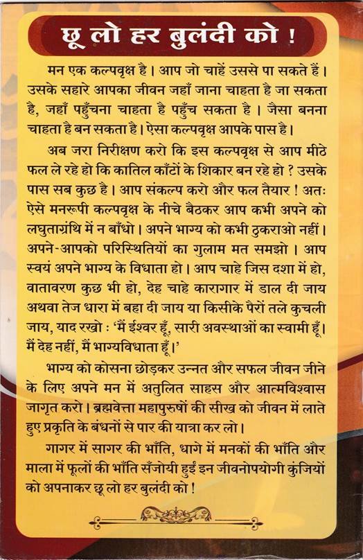 यह पुस्तिका संत श्री आशाराम जी बापू के प्रेरक वचनों एवं सत्शास्त्रों पर आधारित है । इसका एकाग्रतापूर्वक पठन-मनन, चिंतन देदीप्यमान सूरज की तरह आपके जीवन के सारे अंधकार को हरकर आपको परम उज्जवल, ज्योतिर्मय महामंगलमय मार्ग पर अग्रसर करेगा ।