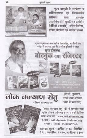 विशेषः 25 दिसम्बर से 1 जनवरी के दौरान श्री आशारामायण जी के पाठ का अवश्य आयोजन करें। उपरोक्त कार्यक्रमों का आयोजन कैसे करें इस बारे में अधिक जानकारी हेतु सम्पर्क करें। (079-27505010-11)